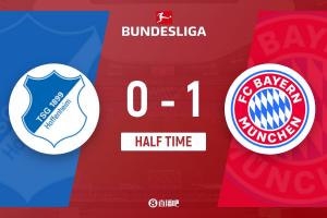 上半場傷停補時1分鐘,半場結束,拜仁暫1-0霍芬海姆。