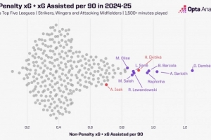 數(shù)據(jù)統(tǒng)計顯示,不計點球情況下,?;倏松腺惣驹诼?lián)賽的每90分鐘預期參與進球值高達0.91,這一數(shù)字僅次于登貝萊、索爾洛特、巴爾科拉和拉菲尼亞,在同期至少出場1500分鐘 的五大聯(lián)賽前場球員(中鋒、邊鋒和前腰)位列第5位。