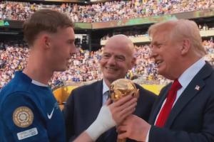 體育資訊07月18日訊 世俱杯決賽,切爾西3-0戰(zhàn)勝巴黎奪冠,賽后美國(guó)總統(tǒng)特朗普參加頒獎(jiǎng)典禮,并且為切爾西球員帕爾默頒發(fā)最佳球員獎(jiǎng)。