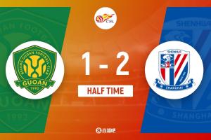 上半場(chǎng)傷停補(bǔ)時(shí)6分鐘,半場(chǎng)結(jié)束,北京國安暫1-2上海申花。