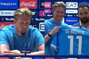 體育資訊7月20日訊 今日德布勞內正式亮相球員發(fā)布會,他手持那不勒斯的11號球衣向公眾展示。
