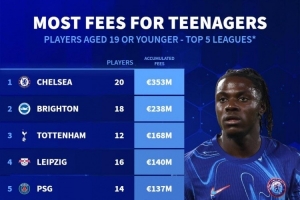 體育資訊7月20日訊 德國轉(zhuǎn)會市場統(tǒng)計了21-22賽季以來五大聯(lián)賽俱樂部引進(jìn)U19(包含19歲)球員的總費(fèi)用,并列出榜單,切爾西居首,布萊頓、熱刺二三位。