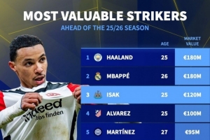 體育資訊7月22日訊 德國(guó)轉(zhuǎn)會(huì)市場(chǎng)統(tǒng)計(jì)了中鋒球員的身價(jià),并列出榜單,哈蘭德、姆巴佩、伊薩克前三,傳聞即將轉(zhuǎn)會(huì)利物浦的?;倏伺琶?位。