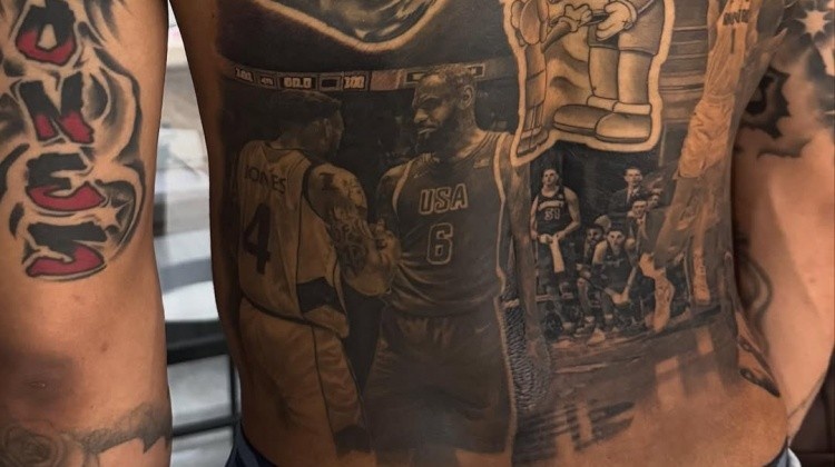 體育資訊7月22日訊 據(jù)美媒Courtside Buzz報道,南蘇丹后衛(wèi)卡里克-瓊斯把奧運會上同詹姆斯交手時的合影紋在了后背上。