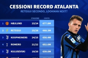 體育資訊7月22日訊 德國轉(zhuǎn)會市場統(tǒng)計了亞特蘭大出售球員的轉(zhuǎn)會費,并列出榜單,霍伊倫居首,雷特吉、庫普梅納斯前三,而盧克曼可能在今夏離隊上榜,預(yù)計轉(zhuǎn)會費4000萬到5000萬歐元。