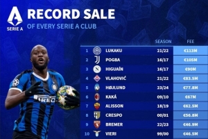 體育資訊7月23日訊 德國轉(zhuǎn)會市場統(tǒng)計了意甲各隊出售球員的轉(zhuǎn)會費紀錄,并列出榜單,國米1.13億歐出售盧卡庫居首。