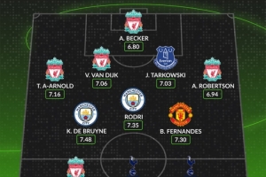 后衛(wèi):阿諾德(利物浦,7.16分)、范迪克(利物浦,7.06分)、塔科夫斯基(埃弗頓,7.03分)、羅伯遜(利物浦,6.94分)