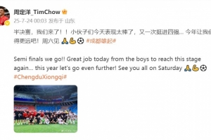 周定洋在個(gè)人微博中寫道:半決賽,我們來了?。⌒』镒觽兘裉毂憩F(xiàn)太棒了,又一次挺進(jìn)四強(qiáng)… 今年讓我們走得更遠(yuǎn)吧!周六見 ??????