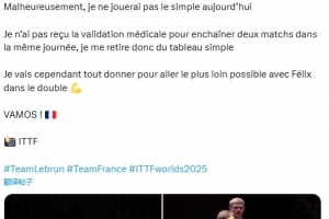 大勒布倫在世乒賽開始之前右手受傷,法國乒協(xié)表示大勒布倫退出單打比賽這一決定是為了球員更好地專注雙打比賽。