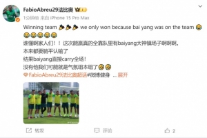 體育資訊5月14日訊 國(guó)安球員法比奧曬球隊(duì)訓(xùn)練勝利小分隊(duì)合照,并調(diào)侃了柏楊。