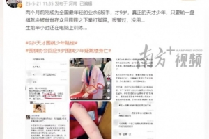近日,多個(gè)自媒體賬號(hào)報(bào)料稱,“年僅9歲的已達(dá)到業(yè)余6段的圍棋手小朱(化名),在受到父親家暴后墜樓?!蓖瑫r(shí)在多個(gè)微信群內(nèi),有網(wǎng)友發(fā)布消息稱,“5月19日晚八點(diǎn)四十六分,經(jīng)確認(rèn):九歲圍棋業(yè)余6段小朋友跳樓后死亡。生前長期因輸棋被父親極端毆打,選擇了輕生?!?/p>