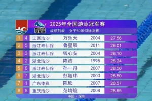 萬樂天決賽中游出了27秒56的成績奪金,浙江14歲小將魯星辰28秒01收獲亞軍,錢心安28秒10奪得季軍,本次比賽的前三名全部達(dá)到世錦賽A標(biāo)。
