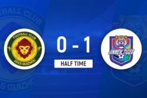 傷停補(bǔ)時(shí)2分鐘。上半場比賽結(jié)束,貴州筑城競技0-1天津津門虎。