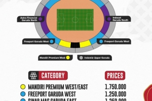 印尼隊官方于今天公布對陣中國隊的比賽票價,共分為4檔,分別是30萬印尼盧比(約131元)、60萬印尼盧比(約261元)、125萬印尼盧比(約545元)以及175萬印尼盧比(約762元)。