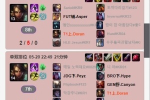 體育資訊5月22日訊 根據(jù)韓服排位統(tǒng)計(jì)小程序顯示,T1上單Doran近日在韓服排位中連續(xù)玩了數(shù)把上單豹女,但是戰(zhàn)績欠佳!