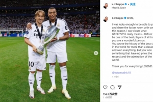 體育資訊5月23日訊 莫德里奇即將離開(kāi)皇馬,姆巴佩發(fā)文祝福。