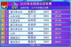 吳卿風(fēng)在決賽中游出了25秒77的成績(jī)奪冠,王一淳25秒80獲得亞軍,張雨霏25秒88拿到銅牌,余依婷25秒89獲得第四。這四人的成績(jī)?nèi)窟_(dá)到世錦賽A標(biāo)。
