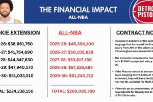 去年,活塞與康寧漢姆簽下一份5年2.24億美元的頂薪續(xù)約合同,因為后者入選了最佳陣容,這份合同的起薪將從工資帽的25%提升至30%,目前為5年2.69億。