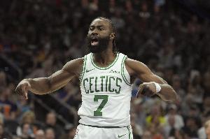 上半場,凱爾特人球星杰倫-布朗表現(xiàn)高效全面,打了21分鐘11投7中,三分3中3拿到17分7籃板6助攻,正負值+6。