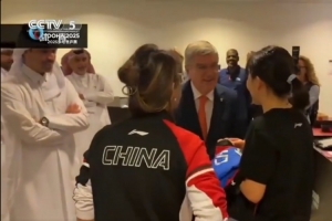 巴赫在索林等人的陪同下先是看了兩場男雙比賽,隨后在參觀體育館時,來到檢錄區(qū)和正在挑球的中國選手陳幸同互動交流。