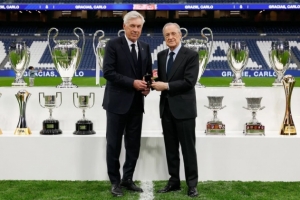 在皇馬2-0皇家社會的比賽之后,皇馬為本場比賽結(jié)束后離任的安切洛蒂安排了告別儀式,這位皇馬歷史上奪冠次數(shù)最多的主教練與弗洛倫蒂諾一起站在草坪上,展示了兩次執(zhí)教皇馬共6個賽季中贏得的15座冠軍獎杯。