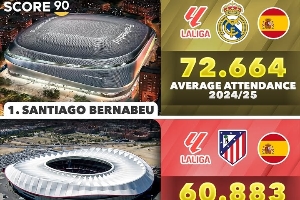 24/25賽季歐洲聯(lián)賽場(chǎng)均上座統(tǒng)計(jì):