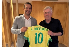巴西足協(xié)主席薩烏德接待安切洛蒂,兩人手拿印有安切洛蒂名字的巴西10號球衣合影。