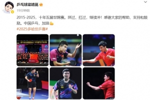 梁靖崑寫道:“2015-2025,十年五屆世錦賽。拼過、扛過,繼續(xù)沖!感謝大家的幫助、支持和鼓勵(lì)。中國(guó)乒乓,加油??”